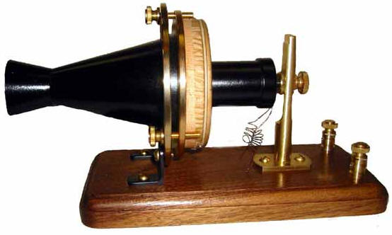 (De eerste telefoon "THE CENTENNIAL MODEL" door Alexander Graham Bell in 1876)